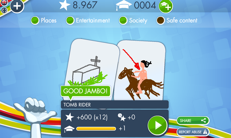 Jambo is a single-player charade game with a community flavour to it. Choose your categories and start solving! No waiting for other players to be available or draw something, and no waiting between riddles. Invest all the time you want in solving every Jambo at your own pace. The Jambo community continuously creates new Jambos for you to play, and our reporting system makes sure offensive or bad jambos are filtered out. Turn on safe mode and only approved jambos will be displayed.