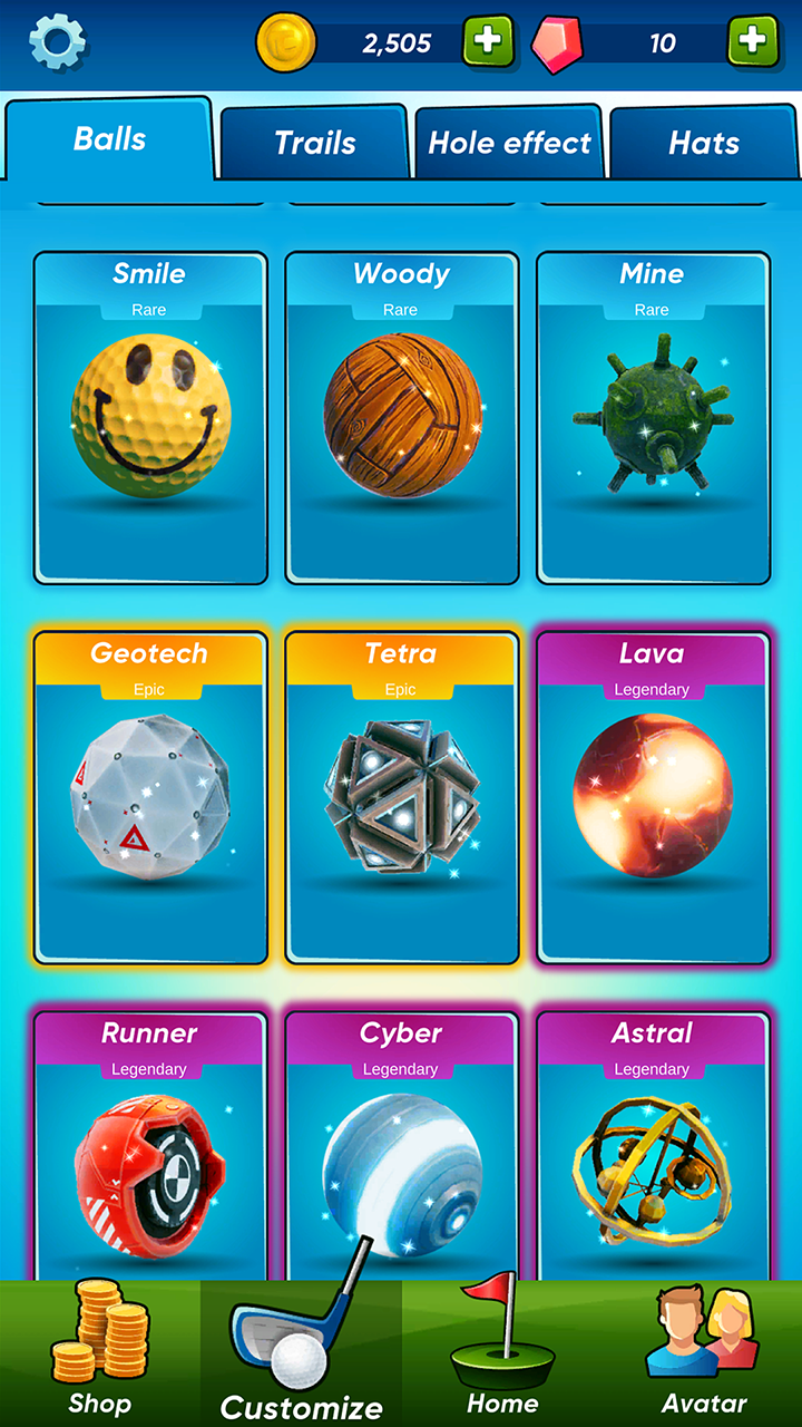 Enjoy an amazing 3D graphics and experience obstacles you’ve never seen on a real minigolf course. Discover and try out all the awesome minigolf tracks in more than 100 levels with more than 100 different balls, dozens of rewards such as hats, effects, trails, avatars and many more.