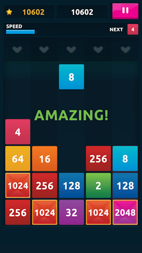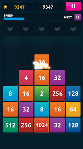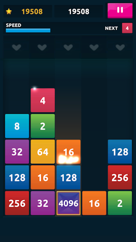 A combination of the classic game of 2048 and Tetris. The numbers are dropping from above and keep coming. Manage to merge numbers and keep the playing field clean for as long as possible. What is the best merge you can make?